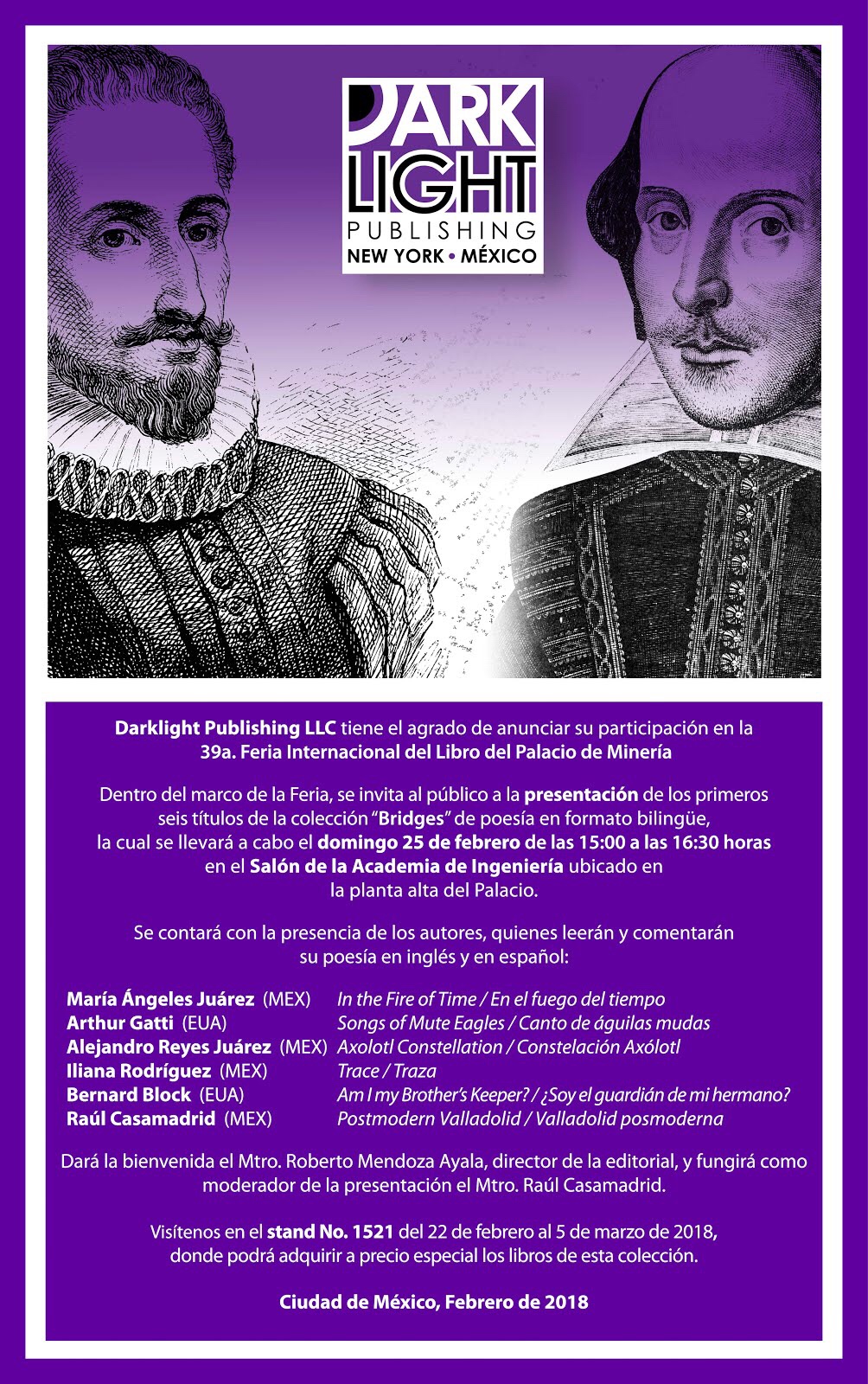 El domingo 25 de febrero, a las tres de la tarde, los autores de Darklight Publishing presentaremos nuestros libros de poesía en la Feria Internacional del Libro del Palacio de Minería.