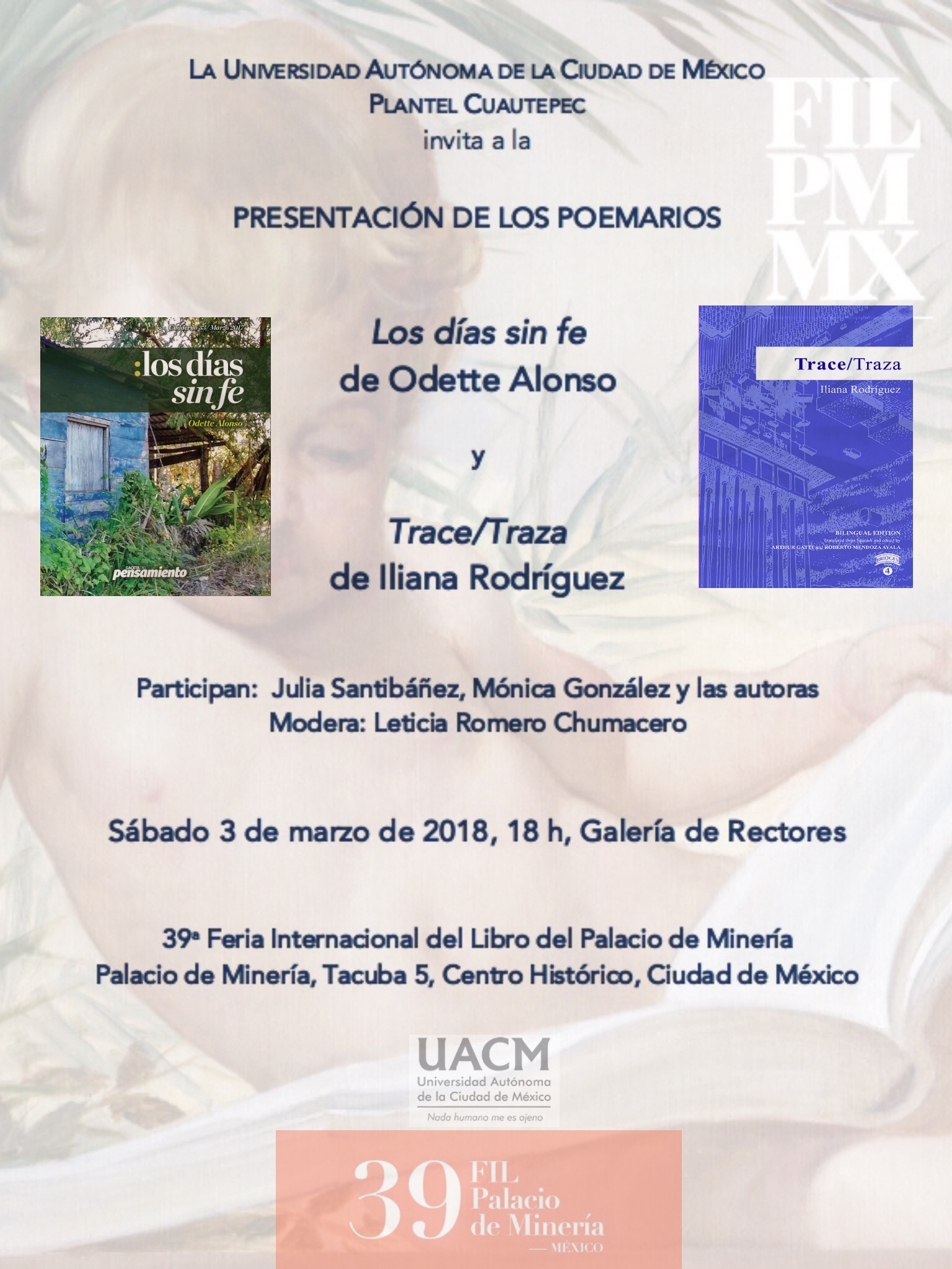 - Sábado 3 de marzo de 2018, 18 h. 39ª Feria Internacional del Libro del Palacio de Minería. Galería de Rectores. Presentación de los poemarios Los días sin fe de Odette Alonso y Trace/Traza de Iliana Rodríguez. Participan: Julia Santibáñez, Mónica González Velázquez y las autoras. Modera: Leticia Romero Chumacero.