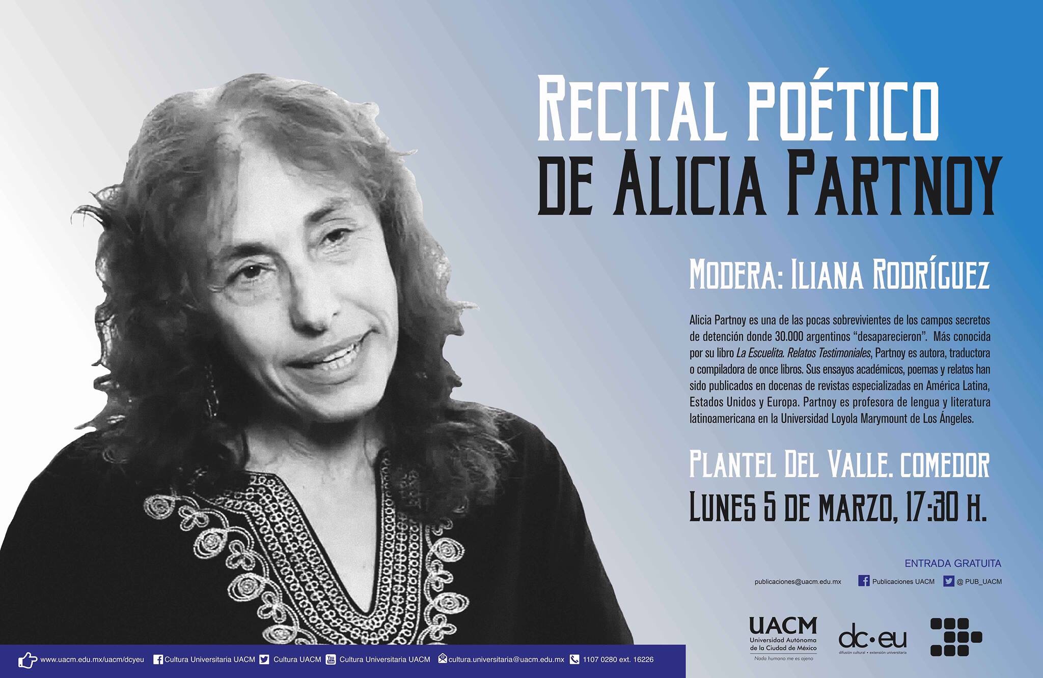 - Lunes 5 de marzo de 2018, 17:30 h. Recital poético de Alicia Partnoy. Modera Iliana Rodríguez. Comedor del Plantel Del Valle de la Universidad Autónoma de la Ciudad de México (San Lorenzo 290, Colonia Del Valle Sur, delegación Benito Juárez, Ciudad de México). Entrada libre.