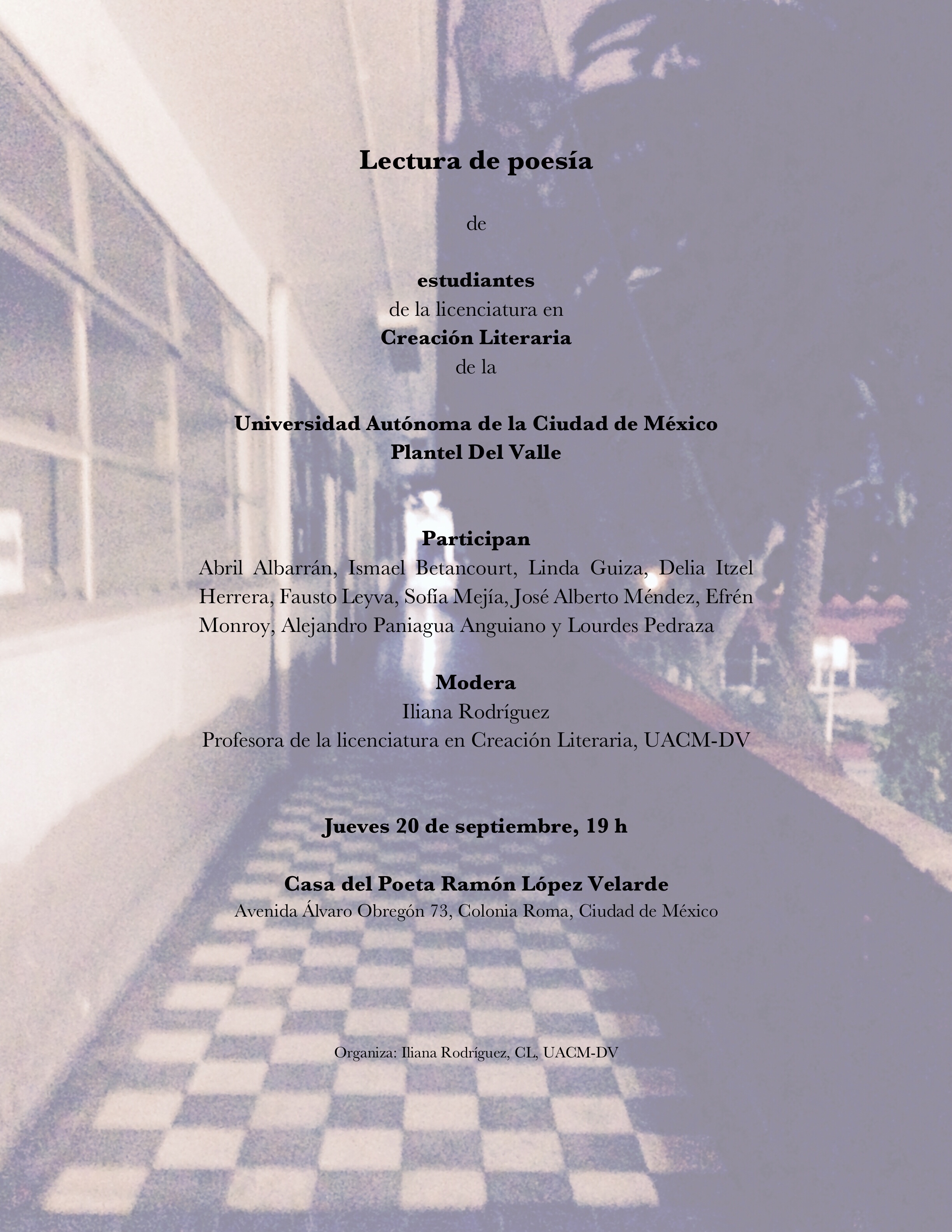 El jueves 20 de septiembre, a las 19 h, nos reuniremos en el Café-Bar Las Hormigas de la Casa del Poeta Ramón López Velarde para escuchar la poesía de diez estudiantes de la licenciatura en Creación Literaria de la Universidad Autónoma de la Ciudad de México, Plantel Del Valle. Tendré el placer de moderar la mesa.