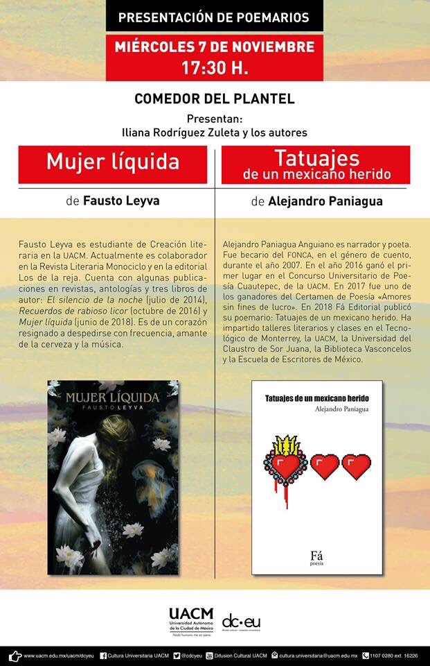 Mujer líquida, de Fausto Leyva, trae a la imaginación un mundo melancólico, marcado por la interrogación existencial… Tatuajes de un mexicano herido, de Alejandro Paniagua, aborda el campo del poema narrativo, de aliento posmoderno… ¿Coincidencias? Quizá la pregunta metafísica ante el vacío o el azar solo de haber coincidido los autores en un salón de clases y la voluntad de presentar juntos sus libros en esta ocasión.