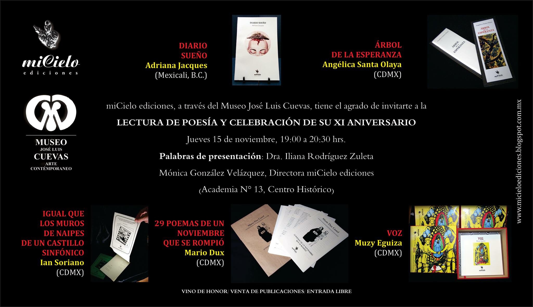 Este jueves 15 de noviembre tendré el honor de participar en la lectura de poesía en celebración del XI aniversario de miCielo Ediciones.