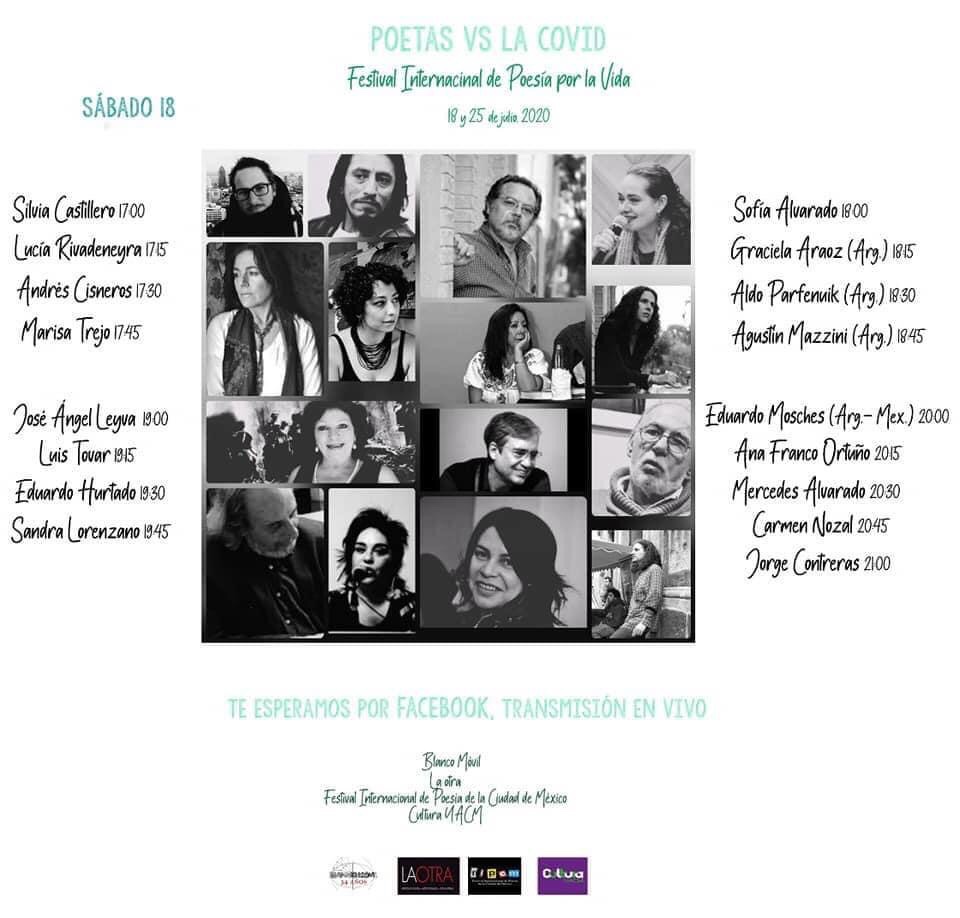 Amigas, amigos, los invito a vernos en el Festival Internacional de Poesía “Poetas vs la Covid, por la vida”. Mi participación será el sábado 25 de julio, de 17:30 a 17:45 (hora de la Ciudad de México).