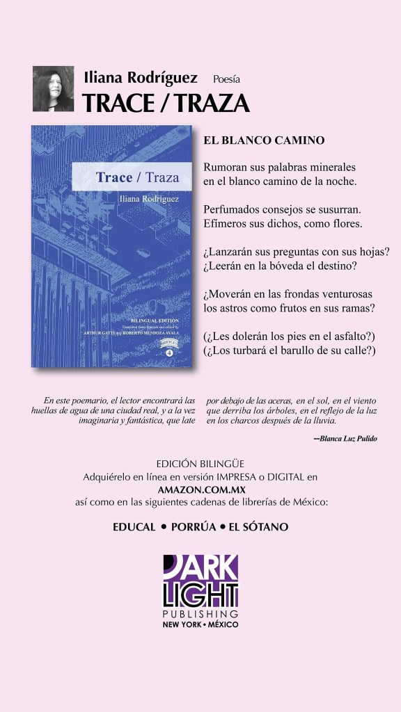 Mi lectura es de un poema que pertenece al libro Trace / Traza, y se transmitirá el miércoles 21 de octubre a las 14 (hora de la Nueva York) por las redes sociales de la Feria.