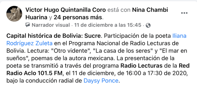 El coordinador general de Radio Lecturas, Víctor Hugo Quintanilla Coro, me invitó amablemente a leer mis propios poemas para este proyecto. La transmisión se hizo por Radio Aclo 101.5 FM, de Sucre, Bolivia, el 11 de diciembre de 2020, de 16:00 a 17:30 h. Esta es la publicación que subieron a Facebook.