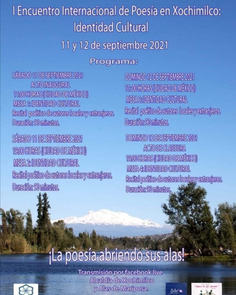 Mañana domingo 12 de septiembre, a las 11 a.m. (hora de la Ciudad de México), participaré en la mesa de poesía organizada por el grupo Alas de Mariposa, dentro del I Festival Internacional de Poesía de Xochimilco.