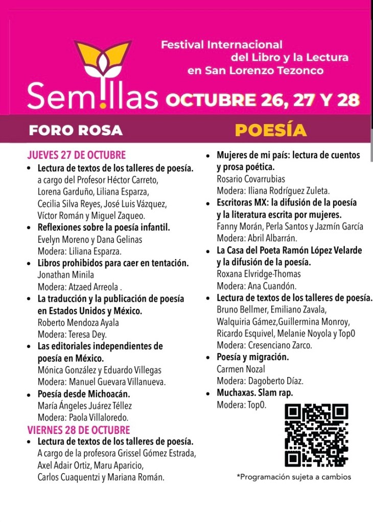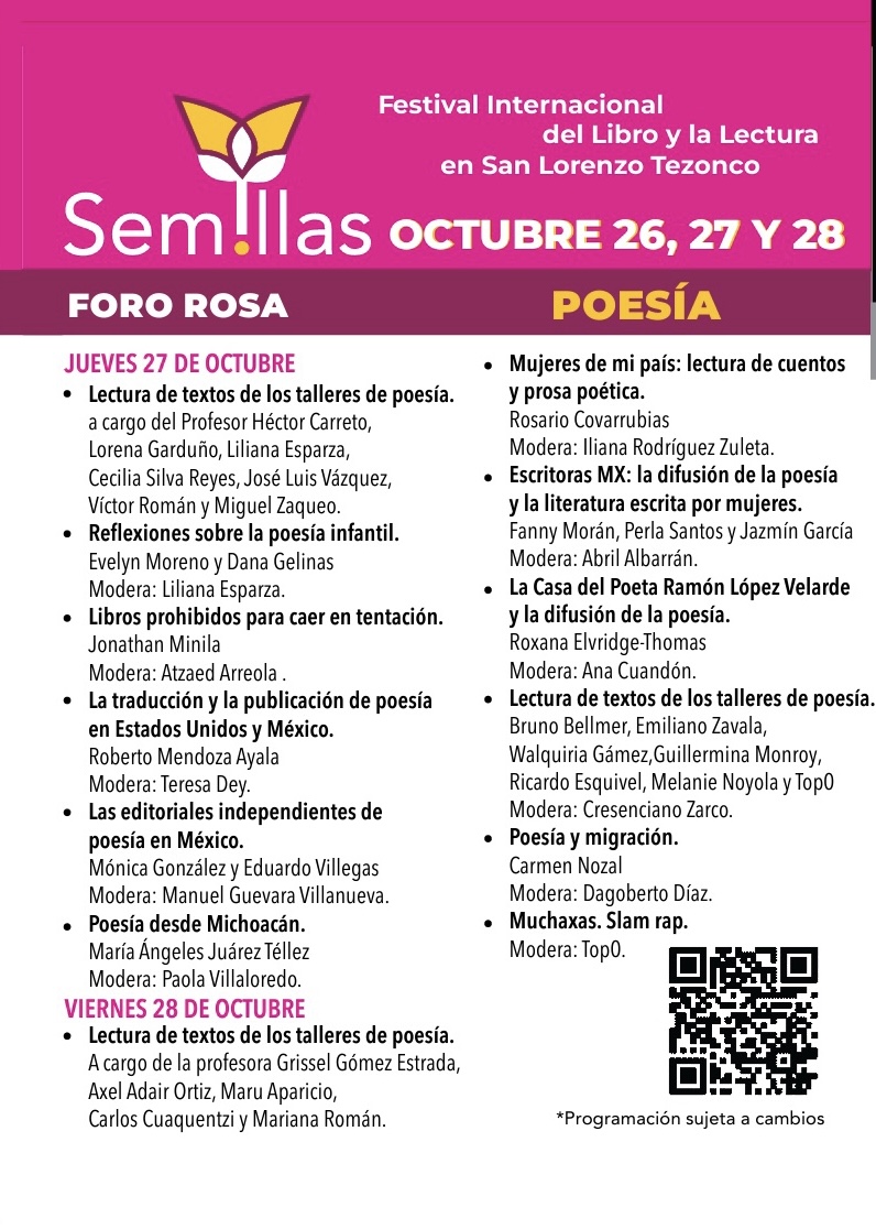 Este año participé en la curaduría del foro de poesía, llamado Foro Rosa, de dicho festival. Tendremos charlas y mesas sobre la labor de las editoriales independientes, la traducción de la poesía, la promoción de la escritura de mujeres, la poesía migrante, reflexiones sobre poesía infantil, poesía desde otros lugares, lectura de talleres de poesía, algo de cuento y slam rap.