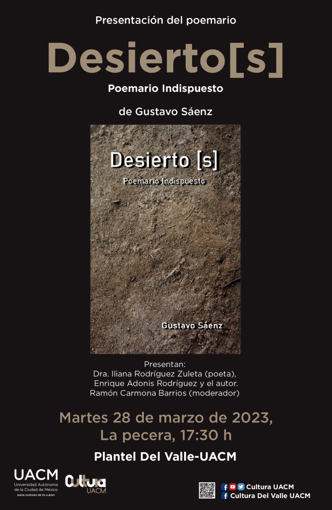 Martes 28 de marzo, 5:30 p.m., en el salón “La Pecera” del Plantel Del Valle de la Universidad Autónoma de la Ciudad de México. Con la presencia del autor Gustavo Sáenz, los escritores Adonis Rodríguez e Iliana Rodríguez Zuleta, y Ramón Carmona como moderador. Entrada libre.