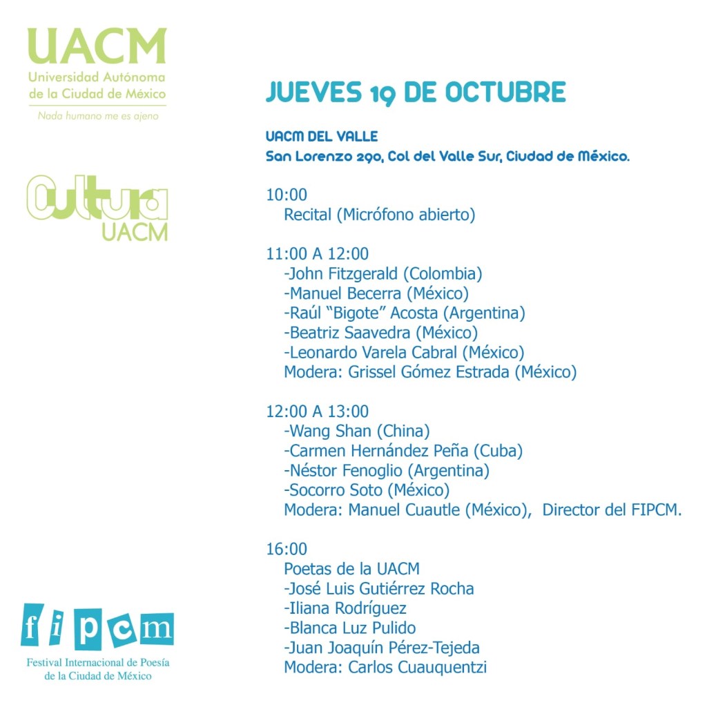 El pasado jueves 19 de octubre, se presentaron algunas mesas del Festival Internacional de Poesía de la Ciudad de México en el Plantel Del Valle de la Universidad Autónoma de la Ciudad de México.
