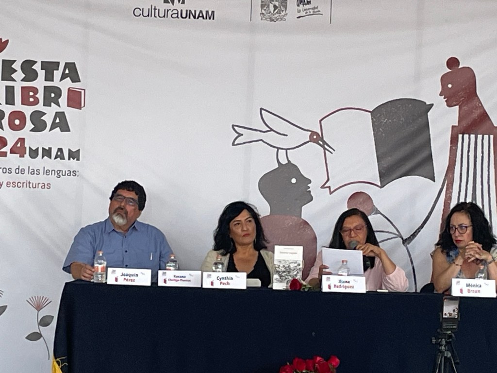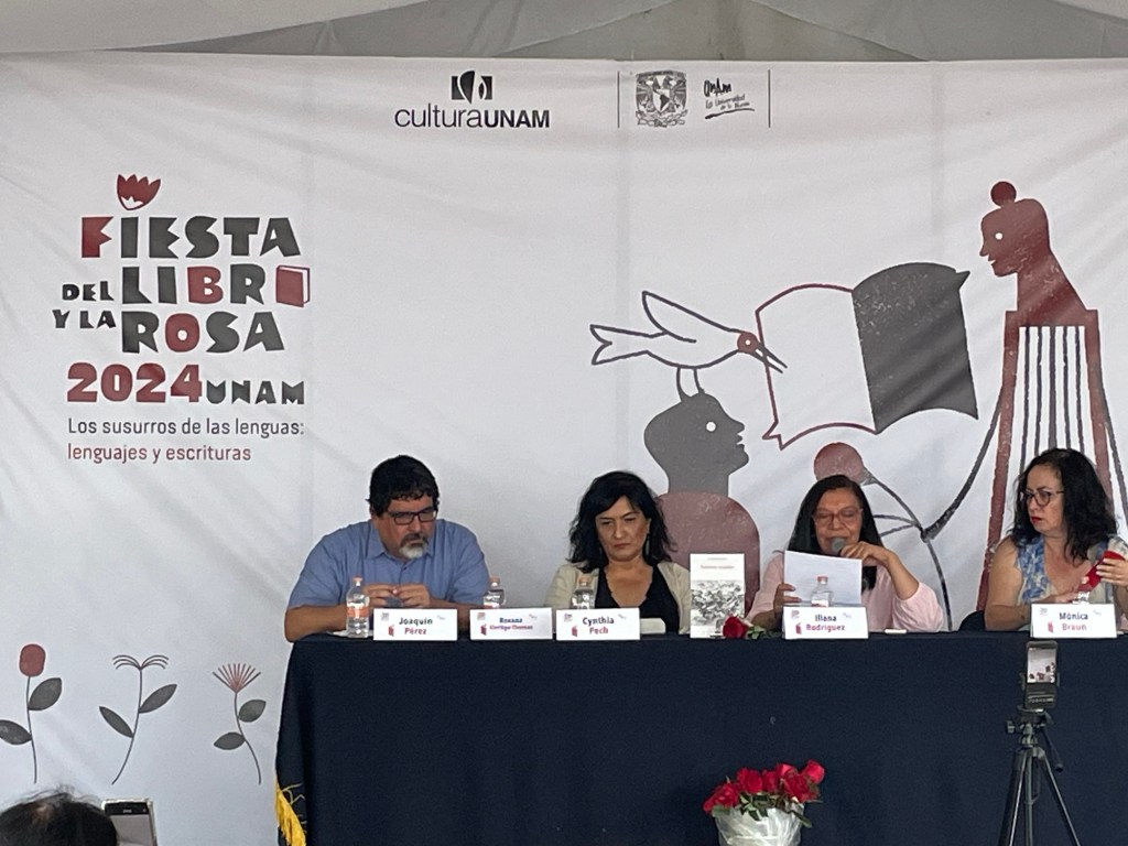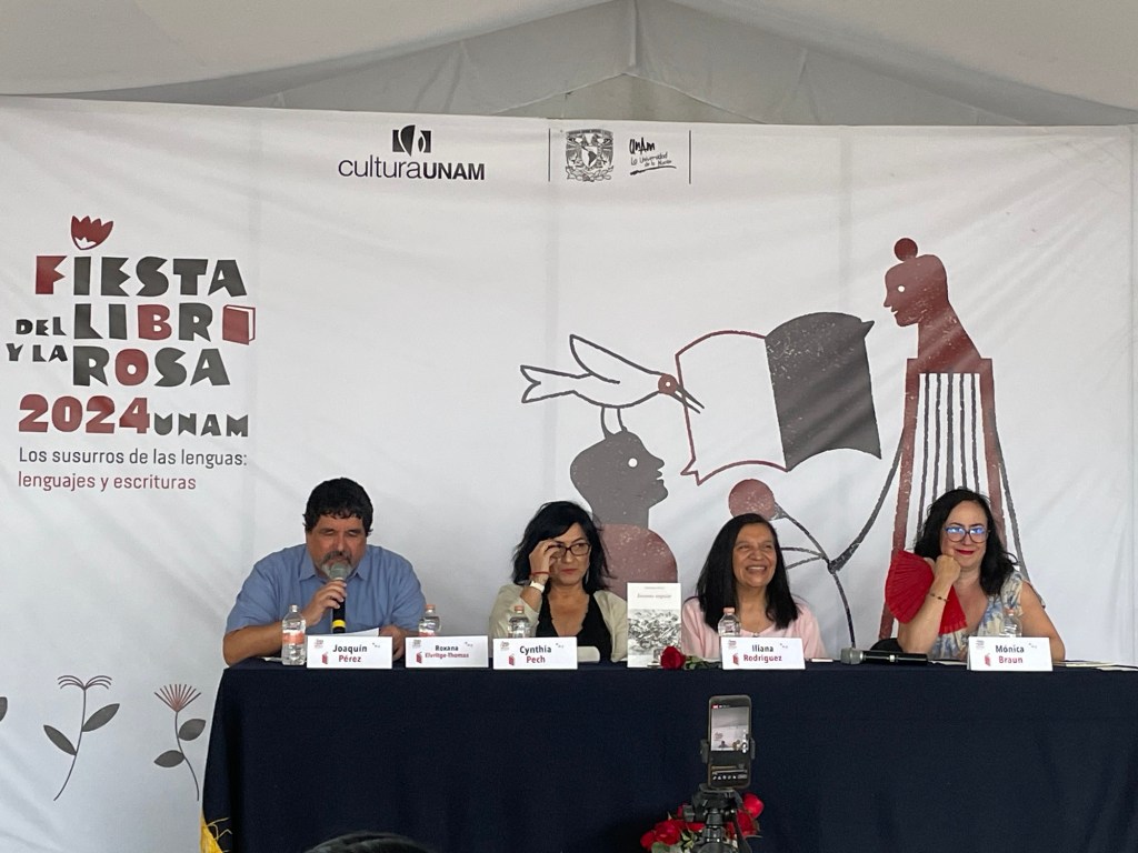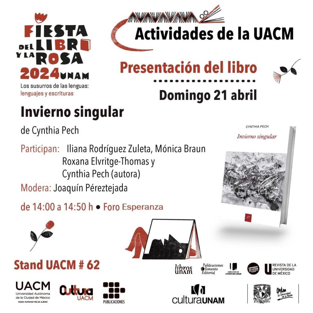 El domingo 21 de abril presentamos el libro Invierno singular, de Cynthia Pech, en la Fiesta del Libro y la Rosa 2024 de la UNAM, sede Ciudad Universitaria. Participamos la autora Cynthia Pech, Mónica Braun, yo (Iliana Rodríguez) y Juan Joaquín Péreztejada, como moderador. También se leyó un texto de Roxana Elvridge-Thomas.