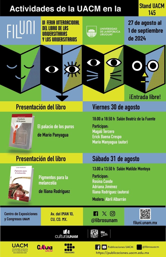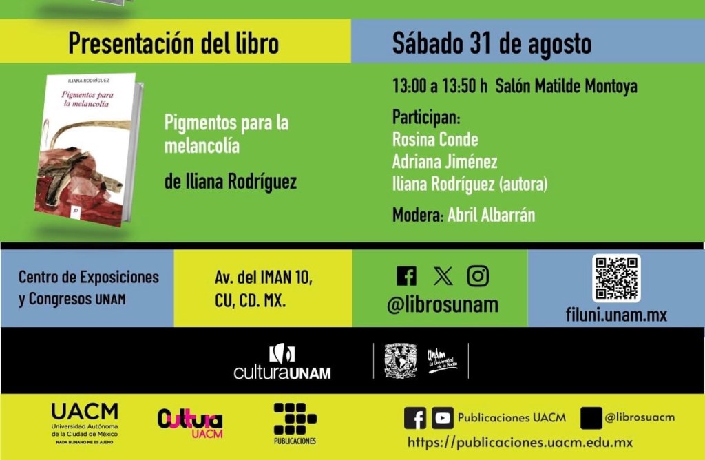 El sábado 31 de agosto presentaremos mi libro Pigmentos para la melancolía en la Feria del Libro de las Universitarias y los Universitarios (FILUNI) de la Universidad Nacional Autónoma de México. ¡Acompáñanos!