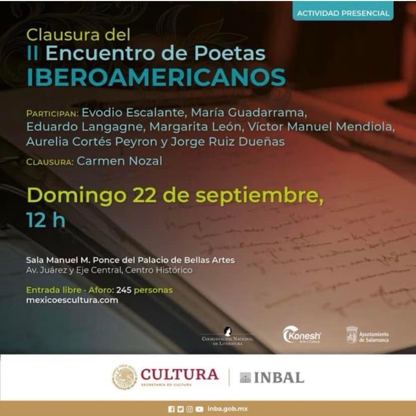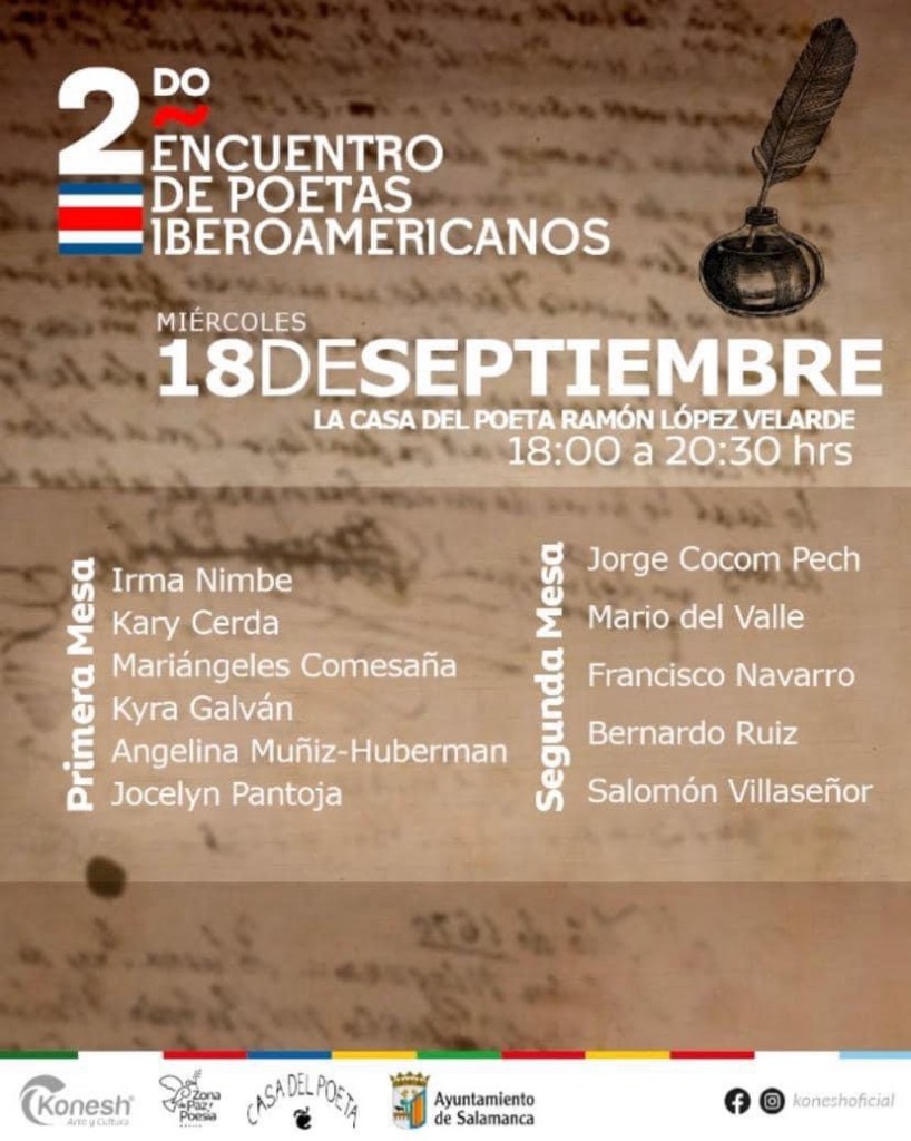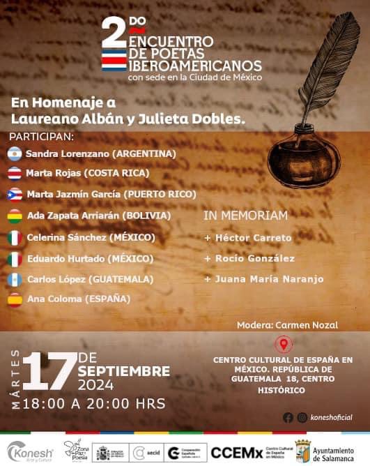El jueves 19 de septiembre, a partir de las 12, habrá dos mesas de lectura del II Encuentro de Poetas Iberomericanos, sede Ciudad de México. Este encuentro es organizado por la poeta hispano-mexicana Carmen Nozal.