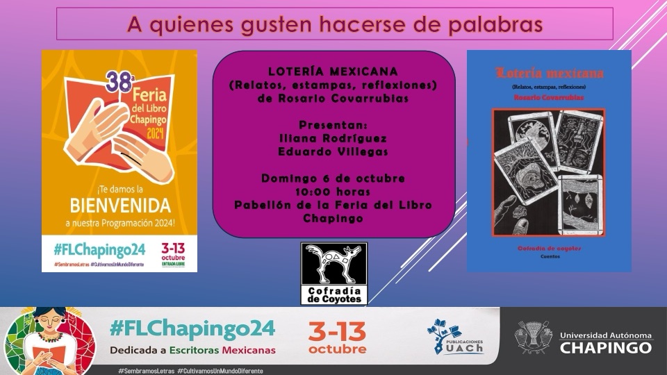 Este domingo 6 de octubre presentaremos el libro Lotería mexicana (relatos, estampas, reflexiones), de Rosario Covarrubias, en la Feria del Libro de Chapingo.