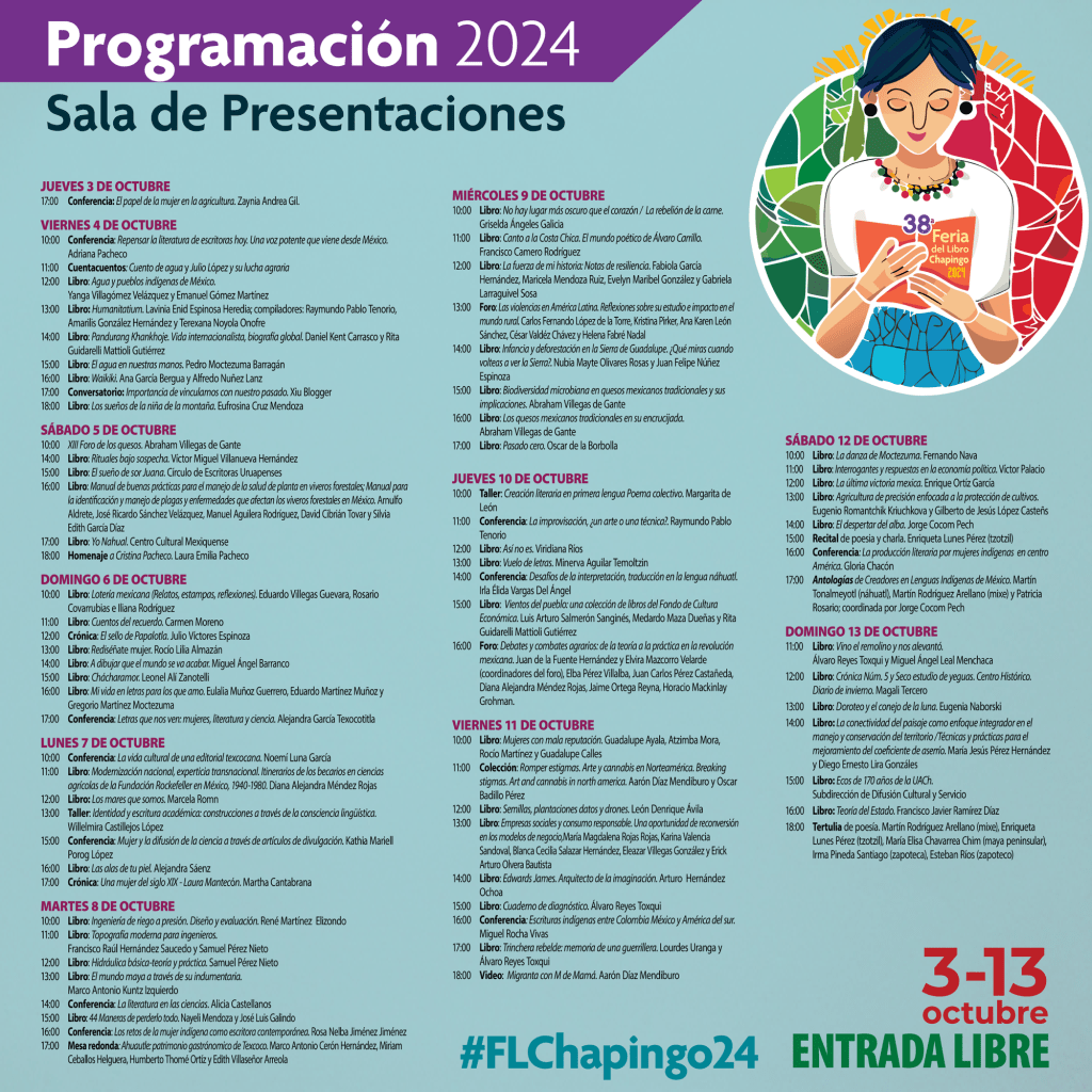 - 38a Feria del Libro Chapingo, Sala de Presentaciones. Domingo 6 de octubre, 10 h. Con la participación de la autora, Eduardo Villegas e Iliana Rodríguez.