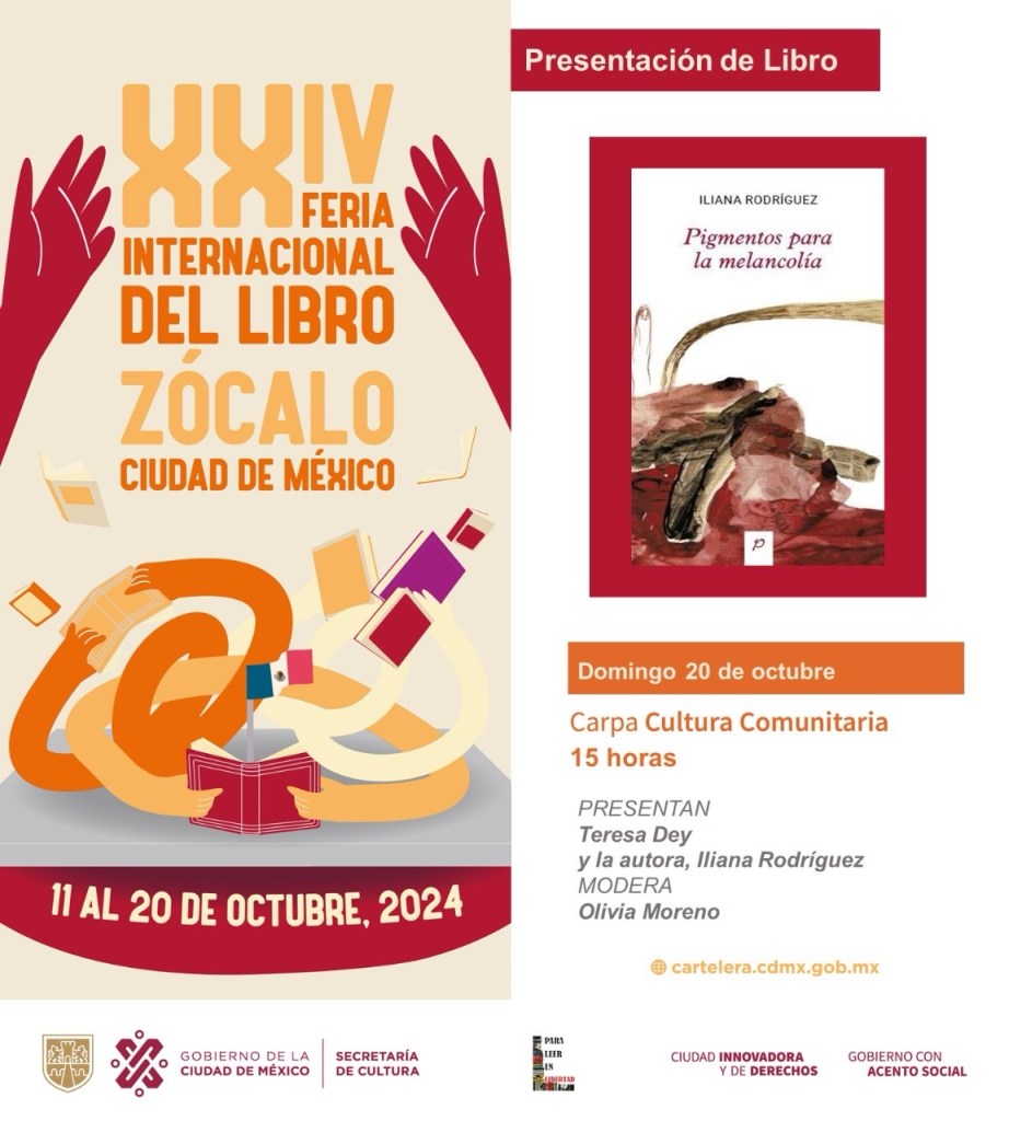 El domingo 20 de octubre, a las 3 h, presentaremos mi libro de poesía Pigmentos para la melancolía en la Feria Internacional del Libro del Zócalo.