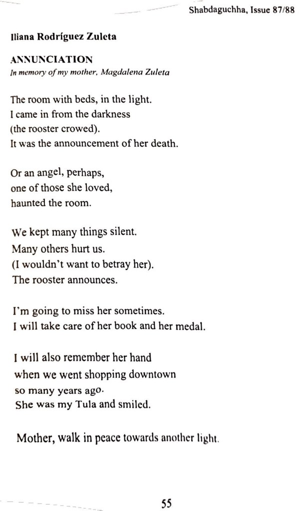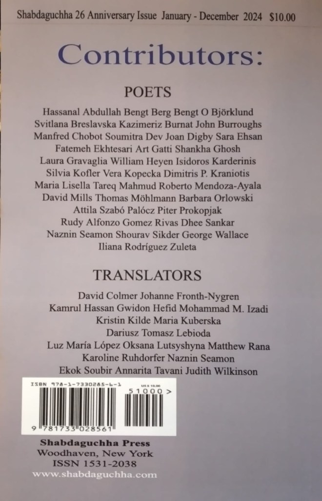 Les comparto que me publicaron dos poemas en Shabdaguchha, revista de poesía que se publica en Nueva York, en lengua inglesa, desde hace veintiséis años. La dirige el poeta Hassanal Abdulah.
