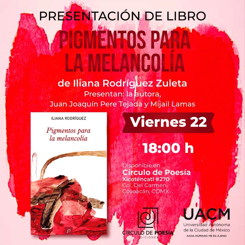 El viernes 22 de noviembre presentaremos mi libro Pigmentos para la melancolía en la Librería Círculo de Poesía. ¡Acompáñanos!