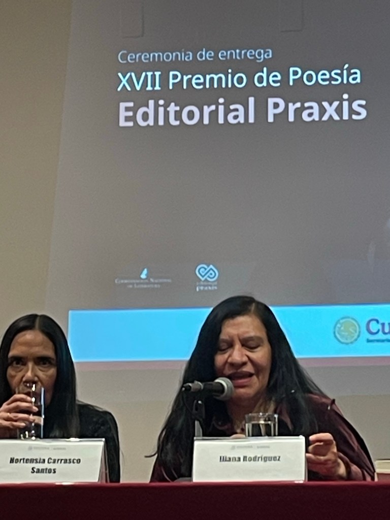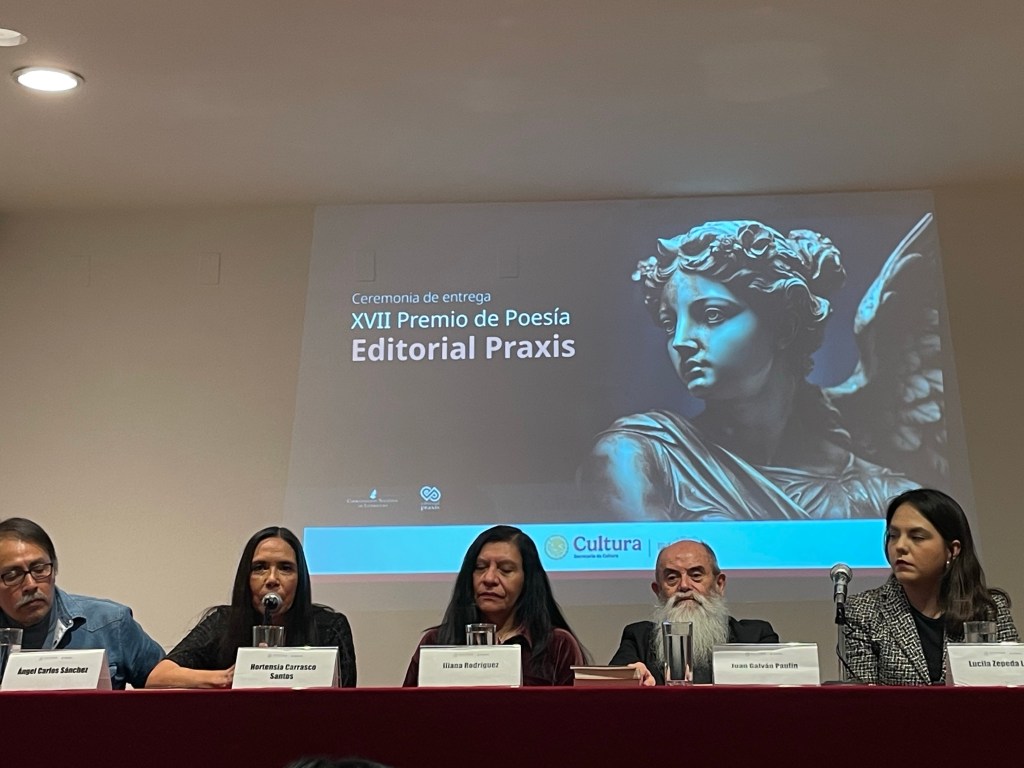 La ceremonia se llevó a cabo en la Sala Adamo Boari del Palacio de Bellas Artes, en Ciudad de México. Participamos Hortensia Carrasco Santos (la poeta galardonada), Juan Galván Paulín, Ángel Carlos Sánchez, Carlos López Barios (director de la Editorial Praxis) y yo (Iliana Rodríguez Zuleta). Moderó Lucila Zepeda López.