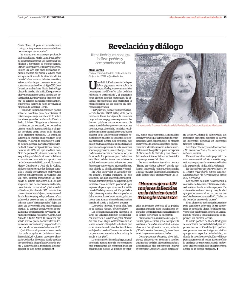 - Mijail Lamas, “Revelación y diálogo”. Confabulario, suplemento número 480, página 13, en el periódico El Universal, Ciudad de México, domingo 5 de enero de 2025, año 108, número 39,118.