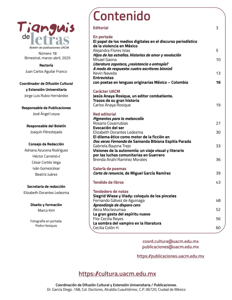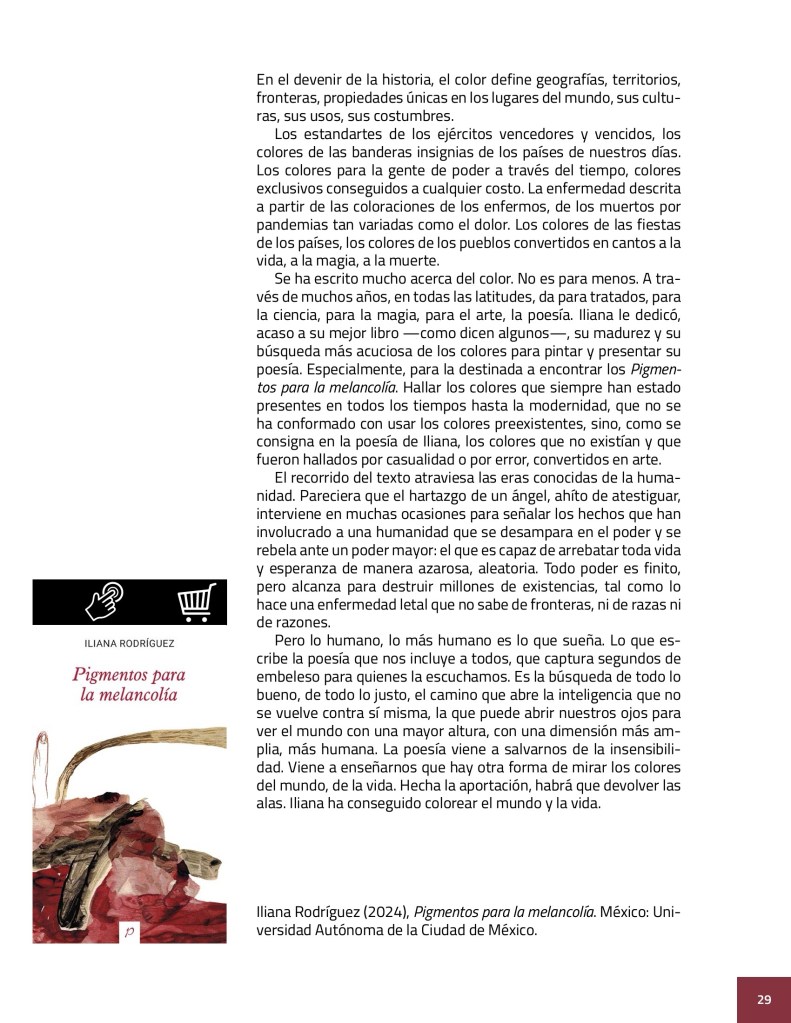La reseña que escribió Rosario Covarrubias sobre mi libro Pigmentos para la melancolía se publicó en Tianguis de Letras, boletín de publicaciones de la Universidad Autónoma de la Ciudad de México.