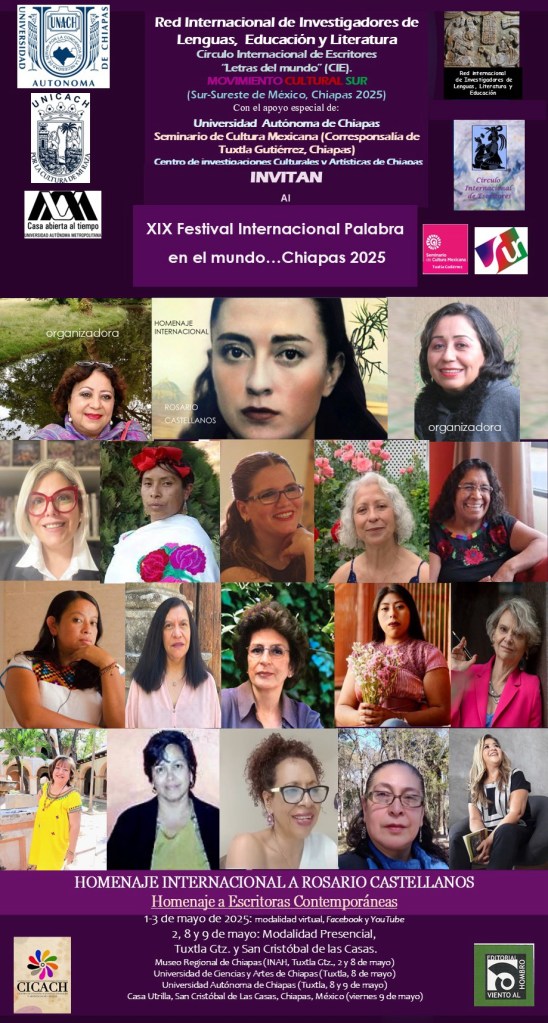 Los días 8 y 9 de mayo se llevará a cabo el XIX Festival Internacional Palabra en el mundo en Chiapas, en el que tendré el gusto de participar con la lectura de mis poemas. Las actividades tendrán lugar en Tuxtla Gutiérrez y San Cristóbal de las Casas.