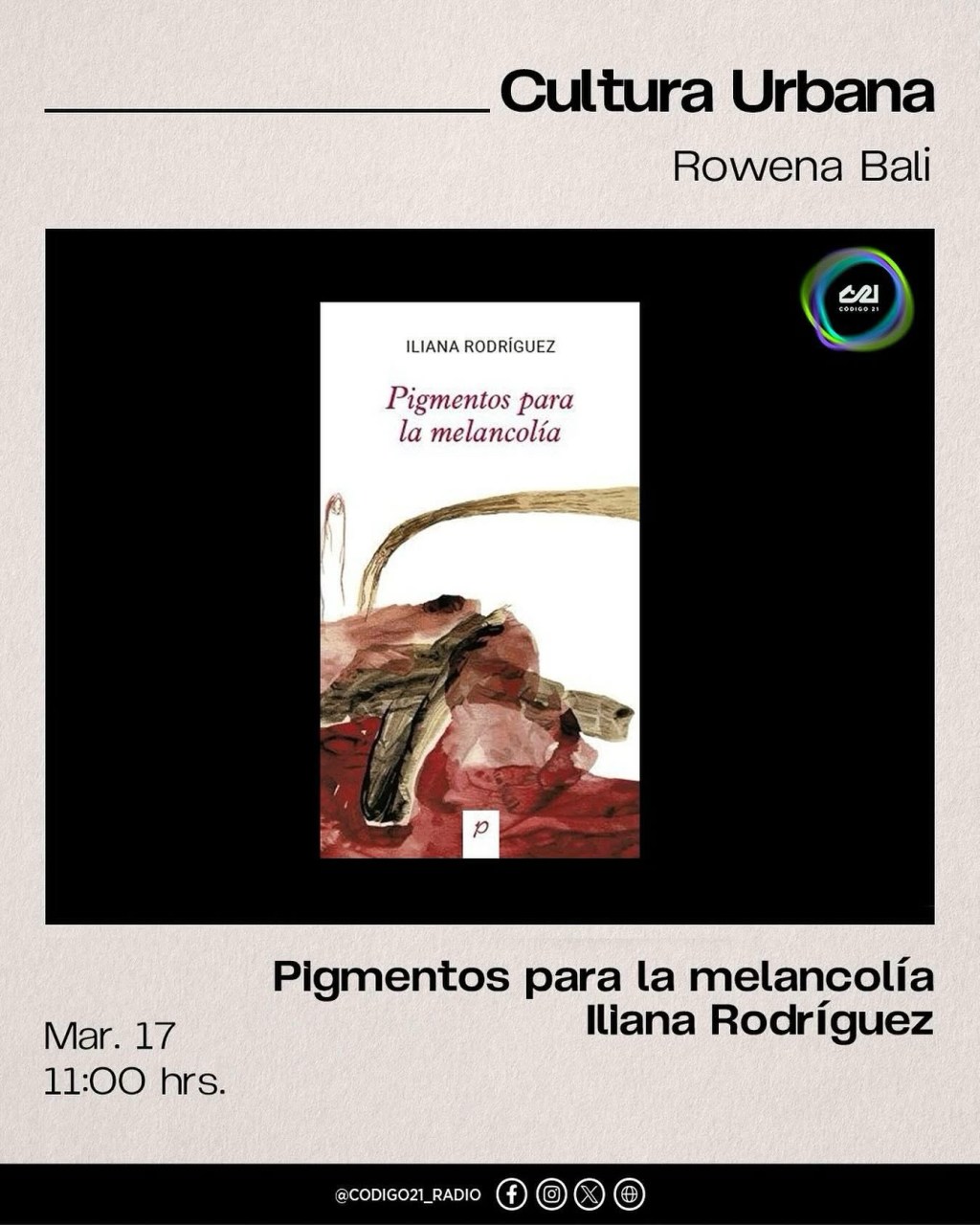Escucha la entrevista sobre mi libro Pigmentos para la melancolía que me hizo Rowena Bali en el programa Cultura Urbana, por Código 21 Radio.