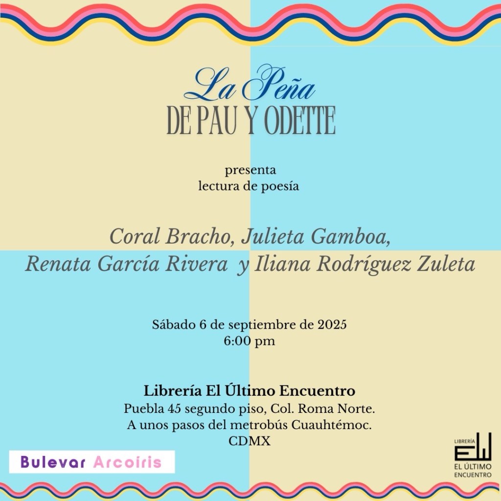 El sábado 6 de septiembre, en La Peña de Pau y Odette, estuvimos leyendo nuestros poemas Coral Bracho, Julieta Gamboa, Renata García Rivera y yo (Iliana Rodríguez Zuleta).